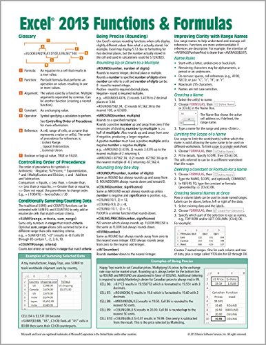 Microsoft Excel 2013 Functions & Formulas Quick Reference Card (4-page Cheat Sheet focusing on examples and context for intermediate-to-advanced functions and formulas- Laminated Guide)
