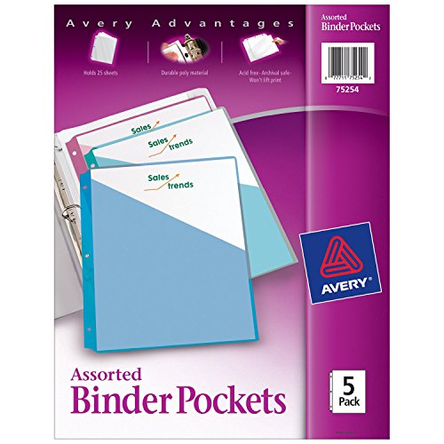 Avery Binder Pockets, Assorted Colors, 8.5" x 11", Acid-Free, Durable, 5 Slash Jackets (75254)