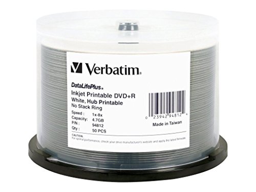 Verbatim DVD+R 4.7GB 8X DataLifePlus White Inkjet Printable, Hub Printable - 50pk Spindle