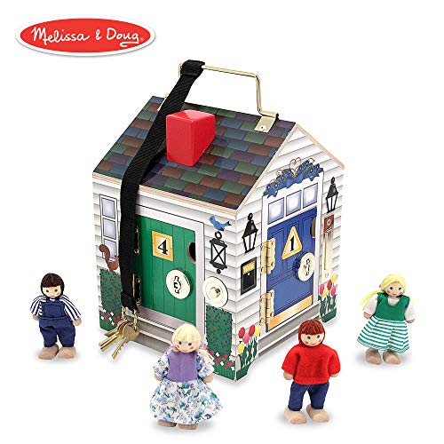 Melissa & Doug Take-Along Wooden Doorbell Dollhouse (Doorbell Sounds, Keys, 4 Poseable Wooden Dolls, 9" H x 6.8" W x 6.8" L)
