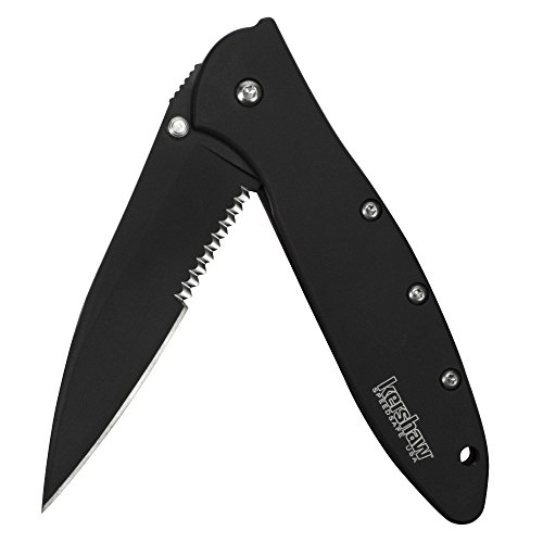 Kershaw Leek, Black Serrated Pocket Knife (1660CKTST); 3” Partially Serrated 14C28N Steel Blade, 410 Stainless Steel Handle, DLC Coated; SpeedSafe Open, Liner and Tip Lock, Reversible Pocketclip; 3 OZ