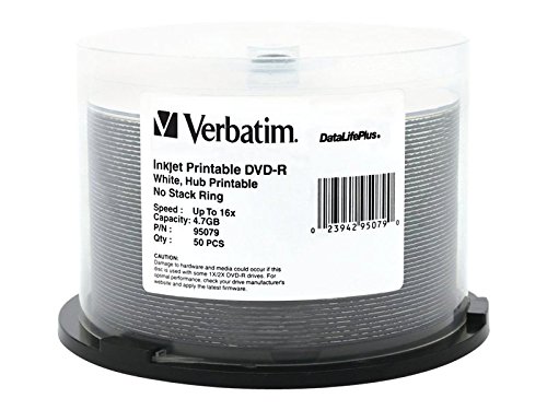 Verbatim DVD-R 4.7GB 16X DataLifePlus White Inkjet Printable Surface, Hub Printable - 50pk Spindle