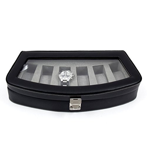 Black Leather 6 Watch Case with Glass Top and Locking Clasp. Pigskin Leather Lined