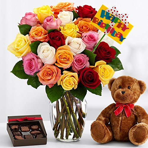 ProFlowers - Multi-Colored Roses Ultimate Birthday Bouquet w/Free Clear Vase - Flowers