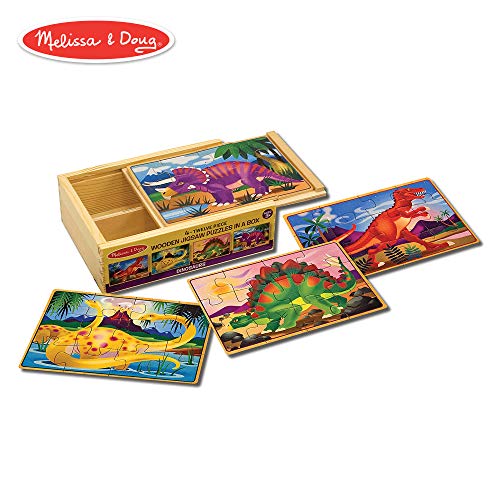 Melissa & Doug Dinosaur Jigsaw Puzzles in a Box (Four Wooden Puzzles, Beautiful Artwork, Sturdy Wooden Storage Box, 12 Pieces, 8” H x 6” W x 2.5” L)