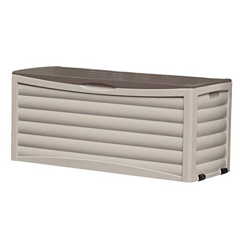 Suncast Resin 103 Gallon Large Patio Storage Box with Wheels - Outdoor Bin Stores Tools, Accessories and Toys - Store Items on Deck, Patio, Backyard - Taupe
