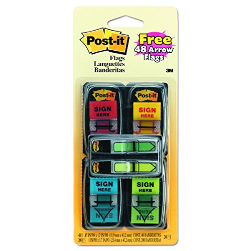 Post-it Message Flags Value Pack,"Sign Here", Assorted Colors, Sticks Securely, Removes Cleanly, 1 in. Wide, 50/Dispenser, 4/Pack Plus Free 48 Arrow Flags, (680-SH4VA)