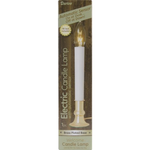 Darice 9” Electric Window Candle Lamp with Light Sensor – Brass-Plated Base Plug-in Lamp – Light Sensor Automatically Turns Candle on at Dusk and Off at Dawn – Includes 7W Glass Bulb