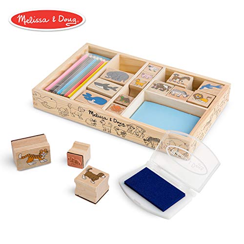 Melissa & Doug Wooden Stamp Set - Animals (16 Stamps, 7 Colored Pencils, Washable Ink Stamp Pad)