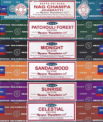 Satya - Set of 6 - Nag Champa, Sunrise, Sandalwood, Midnight, Patchouli, Celestial 15 grams