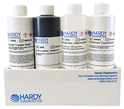 Gram Stain Kit Advanced, with Stabilized Iodine, Produces Brighter Colors for Both Gram Positives and Negatives, 4x8 Ounce, by Hardy Diagnostics