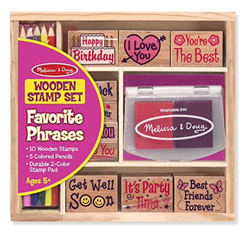 Melissa & Doug Favorite Phrases Wooden Stamp Set - 10 Stamps, 5 Colored Pencils, 2-Color Stamp Pad