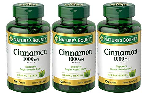 Nature's Bounty Cinnamon Pills and Herbal Health Supplement, Promotes Sugar Metabolism and Heart Health, 1000mg, 100 Capsules, 3 Pack