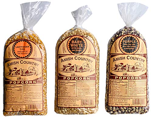 Amish Country Popcorn - 3 (1 Pound Bag) Baby White, Ladyfinger, and Purple Popcorn Gift Set - Old Fashioned, Non GMO, and Gluten Free - Recipe Guide