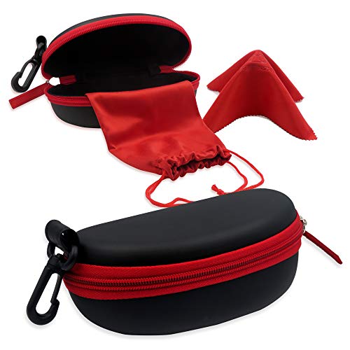 Sport Sunglasses Case, for Everyday Glasses, Eyeglasses & Goggles Fits Standard Size Eyewear, Lightweight, Zipper Closure Belt clip and Cleaning cloth (B15HC BLK/RED)