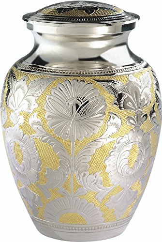 UrnConcern The Classic Silver & Gold Cremation Urn, 6 inch.Hand Engraved Solid Brass with Silver Lacquer Coat. Includes Velvet Storage & Display Box