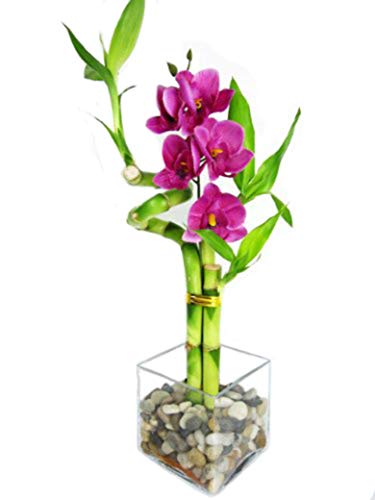 9GreenBox - Lucky Bamboo - Spiral Style with Silk Flowers and Glass Vase with Pebbles
