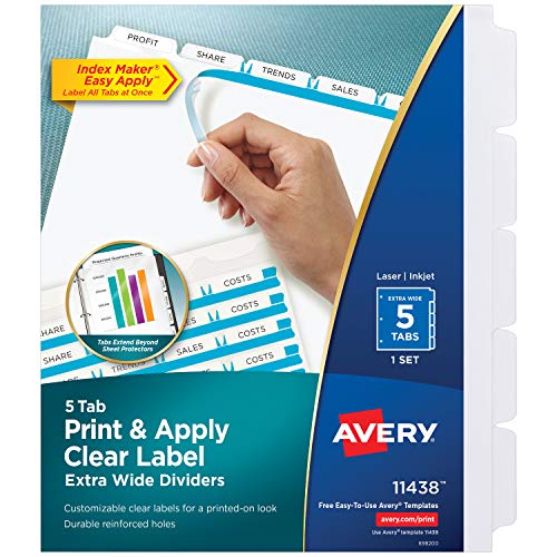 Avery 5-Tab Extra Wide Binder Dividers, Easy Print & Apply Clear Label Strip, Index Maker,White, 1 Set (11438)