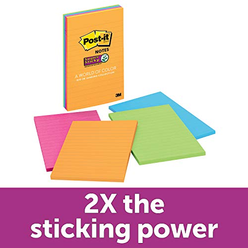 Post-it Super Sticky Notes, 2x Sticking Power, 4 in x 6 in, Rio de Janeiro Collection, Lined, 4 Pads/Pack, 45 Sheets/Pad (4621-SSAU)