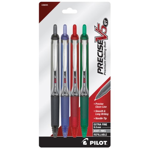 Pilot Precise V5 RT Retractable Rolling Ball Pens Extra Fine Point 4-Pack Black/Blue/Red/Green Inks (26055)