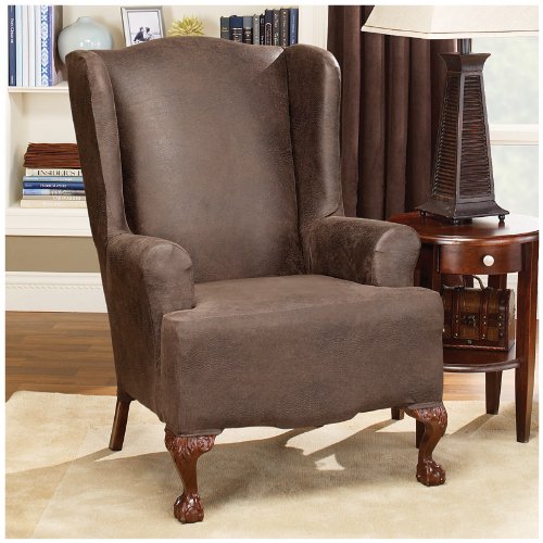 SureFit Stretch Faux Leather - Wing Chair Slipcover, Brown (SF37324)