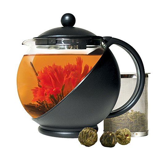 Primula Half-Moon Teapot for Flowering Tea Set – Wide Mouthed Temperature Safe Glass – 40 oz. – Clear Glass with Black Accents – Includes 3 Flowering Teas - Dishwasher Safe