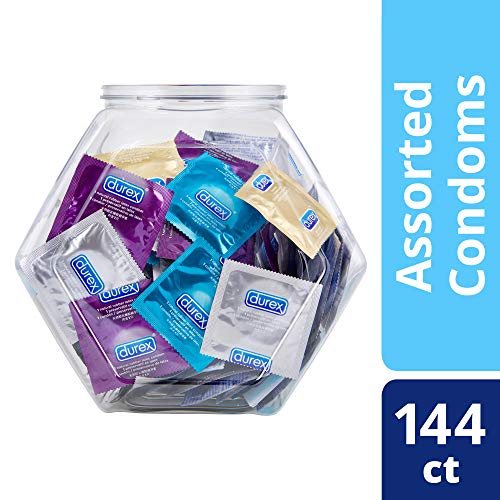 Condoms, Natural Latex, Durex Condom Bulk Variety Fish Bowl 144 Count, Extra Lubricated, Ultra Fine, Dotted, and Large Male Condoms, HSA Eligible