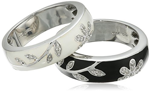 Sterling Silver Black and White Enamel Floral Stacking Rings with Diamond Accents (1/10 cttw, I-J Color, I2-I3 Clarity)