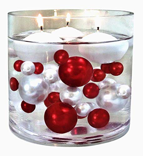 120 NO Hole Red & White Pearls with Matching Gems - Jumbo/Assorted Sizes Vase Decorations & Table Scatters - to Float The Pearls Order The Floating Pack Option