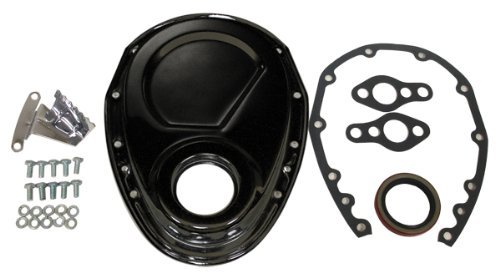 Compatible/Replacement for Chevy Small Block 283-305-327-350-400 Steel Timing Chain Cover Set w/Timing Tab - Black