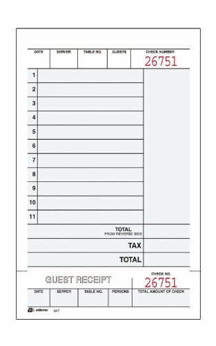 Adams Guest Check Unit Sets, 2-Part, Carbonless, White Bond/Tag, 4-1/4 x 6-3/4 Inches Detached, 250 Sets/Pack (947SWC)