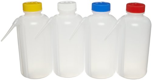 Nalgene 2423-0500 LDPE Color-Coded Unitary Wash Bottle, 500mL Capacity, Colored Polypropylene Screw Cap, Assorted Cap Colors, Pack of Four