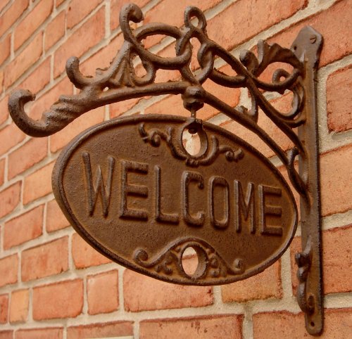 Upper Deck Welcome or Go Away Sign Ornate Cast Iron Front Door Plaque