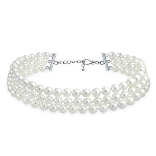 Bling Jewelry Bridal Hand Knotted 3 Row Wide White Simulated Pearl Strand Choker Collar Necklace for Teen for Women Silver Plated