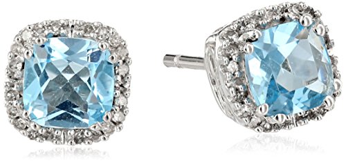 Jewelili 10k White Gold 5mm Blue Topaz Cushion with Diamond Stud Earrings, NEW