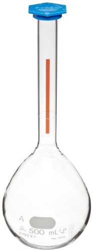 Corning Pyrex 5600-1L Borosilicate Glass 1L +/- 0.3mL Flat Bottom Class A Lifetime Red Volumetric Flask, with Polyethylene Snap-Cap
