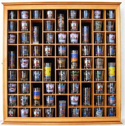 71 Shot Glass Rack Wall Display Case Holder Cabinet, Solid Wood (Mahogany Finish)
