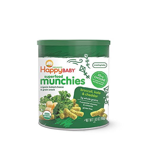 Happy Baby Organic Superfood Munchies Baked Cheese & Grain Snacks Broccoli Kale & Cheddar Cheese, 1.63 Ounce Canister (Pack of 6) Gluten Free Crunchy Snack Dissolves Easily Encourages Self Feeding