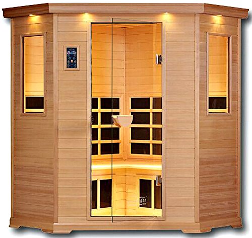 Clearlight CE-C Glass Essential Four Person Corner Sauna Infrared Fusion Carbon/Ceramic Heaters - Very Low to Zero EMF - Nordic Spruce Wood - Lifetime Parts Warranty