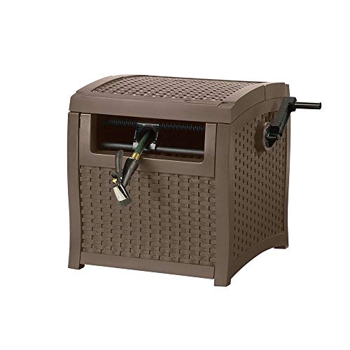 Suncast Resin Hose Hideaway with Hose Guide - Durable Outdoor Hose Storage Reel with Crank Handle, Lid, and Slide Trak Hose Guide - 225' Hose Capacity - Mocha Wicker
