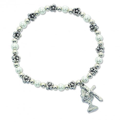 6.5" Catholic First Holy Communion Childrens Girls Rosary Bracelet White Imitation Pearl Stretch with Cross & Chalice.…