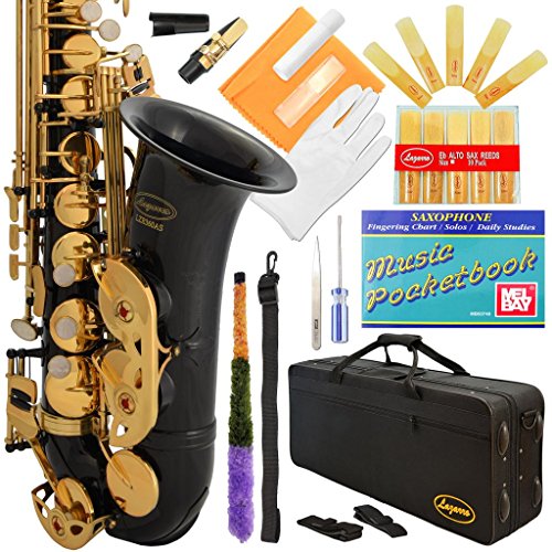 Lazarro Professional Black-Gold Keys Eb E Flat Alto Saxophone Sax, 11 Reeds, Case & Many Extras - 24 COLORS Available - 360-BK