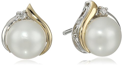 Sterling Silver and 14k Yellow Gold Diamond Accent Freshwater Cultured Pearl Stud Earrings (7mm)