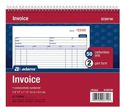 Adams Spiral Invoice Book, 8 1/2 x 7 1/4 Inches, 2-Part, Carbonless, White/Canary, 50 Sets per Book (SCD8740)