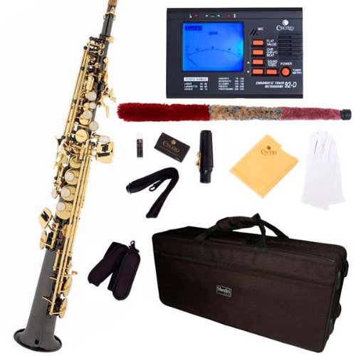 Mendini by Cecilio MSS-BNG+92D Black Nickel Plated and Gold Keys Straight B Flat Soprano Saxophone with Tuner, Case, Mouthpiece, 10 Reeds and More