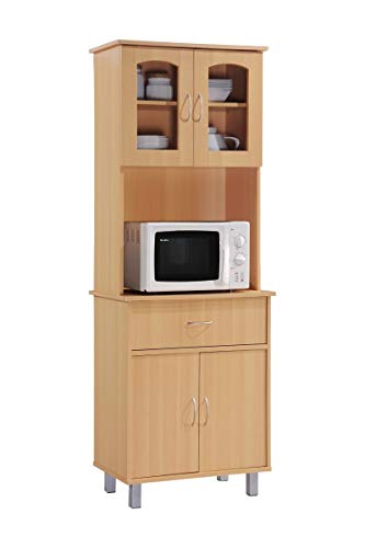 Hodedah Long Standing Kitchen Cabinet with Top & Bottom Enclosed Cabinet Space, One Drawer, Large Open Space for Microwave, Beech