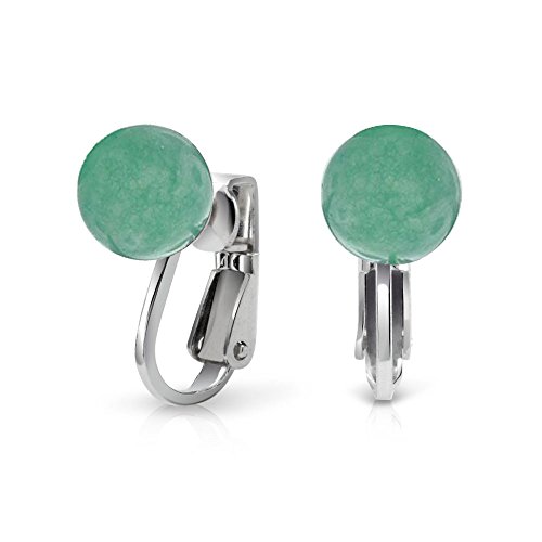 Simple Light Green Aventurine Gemstone Bead Round Ball Clip On Earrings Non-Piercing 925 Sterling Silver 8MM