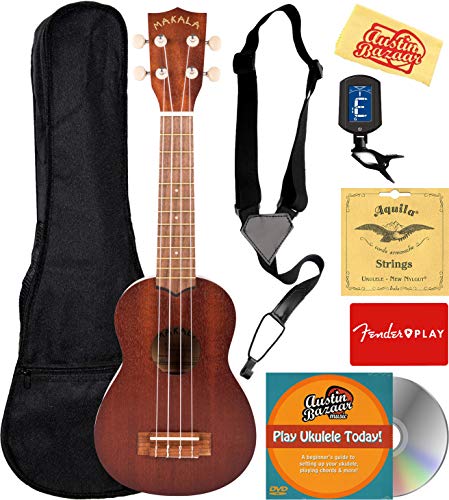 Kala MK-S Makala Soprano Ukulele Bundle with Gig Bag, Tuner, Strap, Aquila Strings, Online Lessons, Austin Bazaar Instructional DVD, and Polishing Cloth
