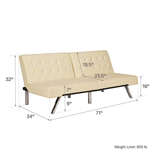 DHP Emily Futon Sofa Bed, Modern Convertible Couch With Chrome Legs Quickly Converts into a Bed, Rich Vanilla White Faux Leather