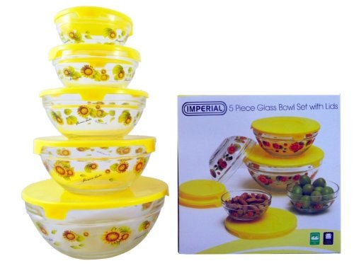 Imperial 5 Pcs Glass Nested Dipping or Storage Bowls with Yellow Sunflower Design and Yellow Lid